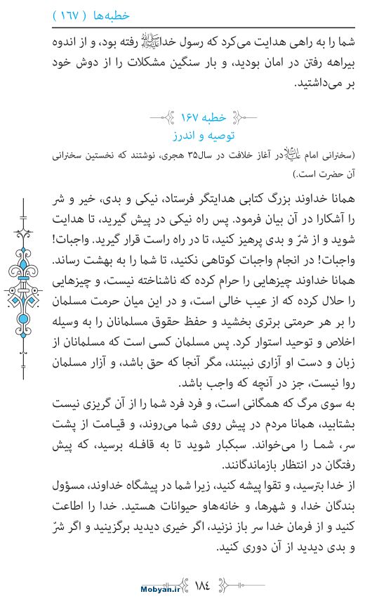 این سخن را پس از آن که برای خلافت با آن حضرت بیعت کردند، در پاسخ بعضی از یارانش که به او پیشنهاد کردند: اگر جمعی از آنان را که مردم را علیه عثمان شوراندند، کیفر می دادی (بر پیشرفت کار خلافت مناسب تر بود) فرمود: ای برادران، من به آنچه که شما می دانید جاهل نیستم، ولی چگونه نیرویی آماده سازم برای کیفر دادن به آنان، در صورتی که گروهی که مردم را علیه عثمان شوراندند، از سیطره و شوکتی برخوردارند که بر ما مسلطند، نه ما بر آنان. می بینید که بندگان شما و اکثر مردم معمولی با آنان جوشیده و اعراب شما به آنان گرویده اند و آنان در لابلای جمع شما هستند و هر چه بخواهند با تلخی های آن، بر شما وارد می سازند. با این حال، آیا امکان و توانایی به دست آوردن آنچه را که می خواهید در اختیار دارید؟ این یک حادثه از مانده های جاهلیت است، و برای این مردم ریشه و حامیان فراوانی است. مردم در این حادثه اگر به غلیان بیفتند و مورد تحقیق و تحلیل قرار بگیرند، دارای عقایدی گوناگونند: گروهی از آنان موافق نظر شمایند. گروه دوم نظری غیر از نظریه شما دارند و جمعی دیگر نه بر این عقیده اند و نه بر آن عقیده. شما صبر کنید و فرصت بدهید تا مردم آرام شوند و دل ها در موقعیتهای خود جای گیر شوند و حقوق به آسانی قابل استیفاء شود. سکوت کنید در وظیفه ای که من باید انجام بدهم و منتظر باشید برای دستور من که به شما خواهد رسید و کاری انجام ندهید که نیرویی را متزلزل سازد و قدرتی را از بین ببرد و سستی و ذلت به بار آورد. و تا آنجا که بتوانم از شعله ور ساختن آتش جنگ خودداری خواهم کرد. و آنگاه که چاره ای ندیدم، دوای آخرین، داغ کردن است.
