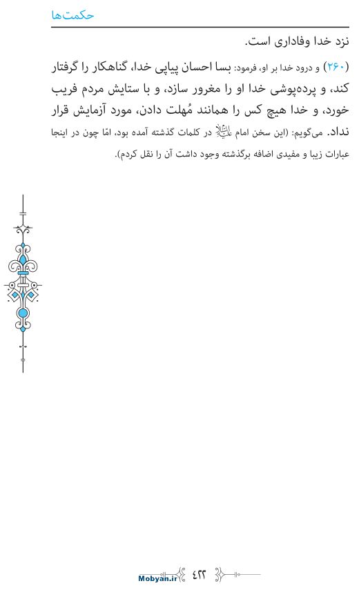 ترجمه : علامه جعفریو فرمود: بسا کسی که به وسیله احسان بر او، به حال خود رها شده و گرفتار گردیده است و بسا کسی که به جهت پوشش گناهانش فریب خورده و بسا شخصی که به جهت سخنان نیکو که به گوشش می رسد، فریفته و شیفته خویشتن گردد و به اضطراب افتد و خداوند هیچ کس را مانند کسی که با امتیازات و خواستنی های دنیا اشباع شود، مبتلا نکرده است.
