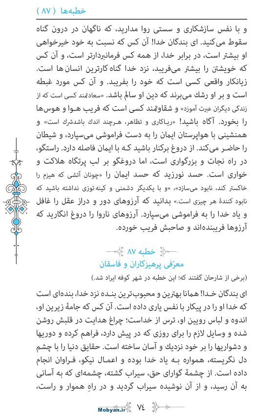 نمایش نهج البلاغه - خطبه : 87 - صفات پرهیزکاران
